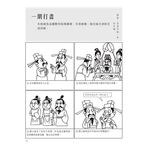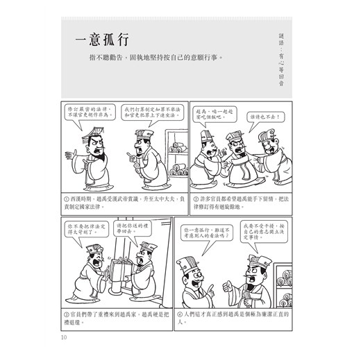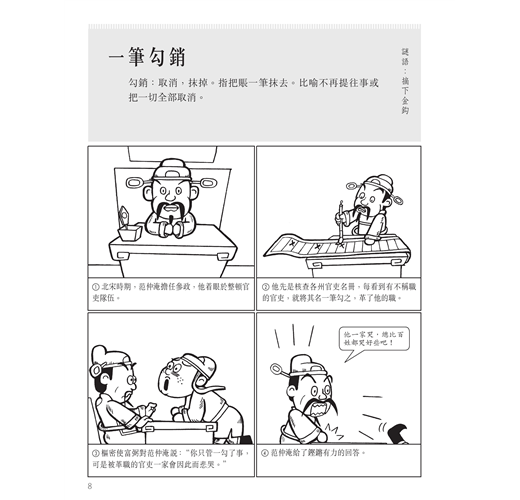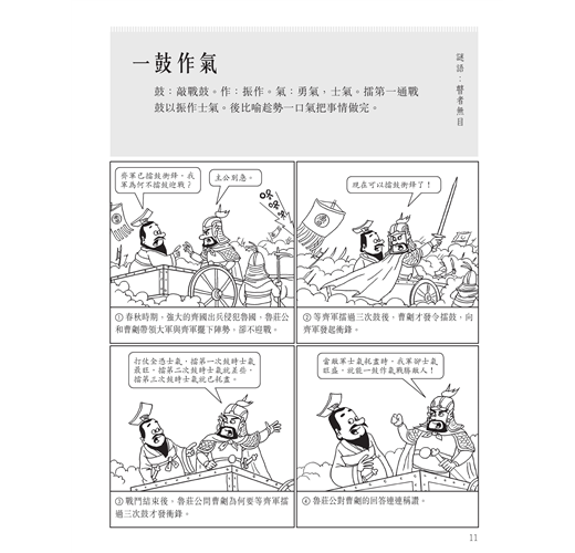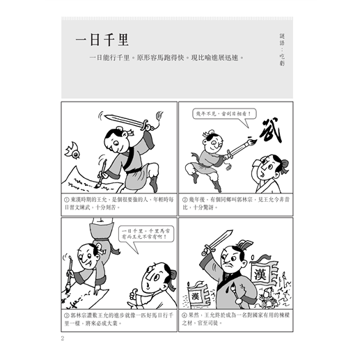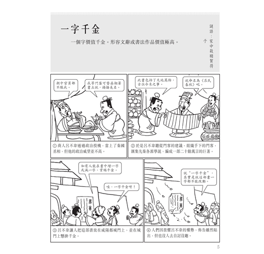 從歷史史實、古代戰爭、民間故事中選擇精彩成語故事,每頁解釋一條成語,以活潑的漫畫講述一個完整的成語故事。另外,為了增加閱讀趣味,針對成語詞條的用字還設計了字謎,附在每頁成語的一側。
