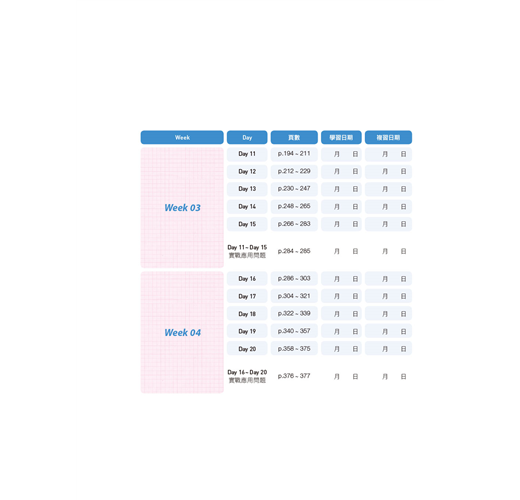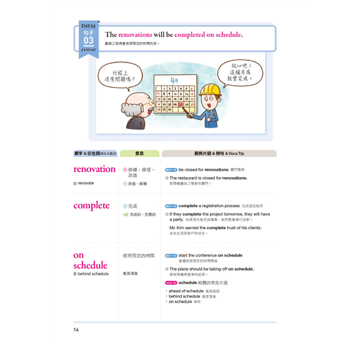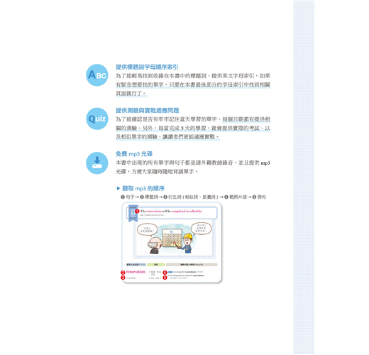 「Warming Up 單元」預習例句及單字 、每日「10句例句+單字」份量適中、「Quiz單元」提供每日複習測驗,每周更有「實戰練習題目」測驗當週學習成果,完整檢視學習成效。