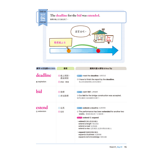 專業外師錄製,標準發音MP3,提供「句子→標題單字→衍生單字(相似詞、反義詞)→範例片語→例句」的詳細內容,所有重點一網打盡,隨時隨地都能複習單字並加強聽力。