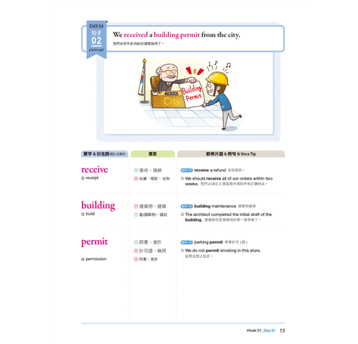 硬背單字還不如在例句及有趣的情境插畫中自然學會單字,才能留下深刻印象。特殊的螺旋式複習方式讓單除了在句子中,透過出現三次以上的標題詞、插圖、Quiz,以單字反覆出現+圖像聯想加深單字印象。