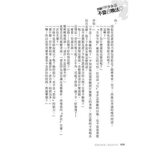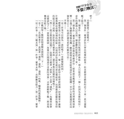 「總覺得第三件事和前面兩件不太一樣。記得祈宿小姐曾經說過,如果靈華不論做什麼都無法改變局勢的時候,出現的評估結果就只會是壞結果。但那應該是礙於她當時的能力還不成熟。對於現在的靈華來說,還有著無法改變的局勢嗎?」