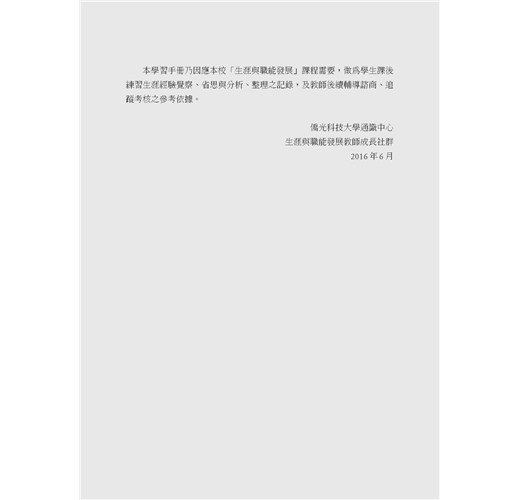本學習手冊乃因應本校「生涯與職能發展」課程需要,做為學生課後練習生涯經驗覺察、省思與分析、整理之記錄,及教師後續輔導諮商、追蹤考核之參考依據。