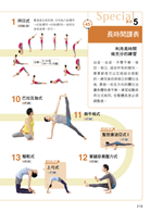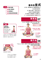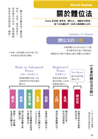 圖解式的目錄, 讓您一眼就能看到各種體位法的姿勢。而且還製作了詳細的中文索引與英文索引, 幫助您利用名稱也能快速找到體位法的位置。