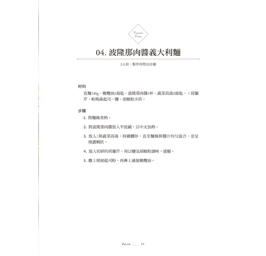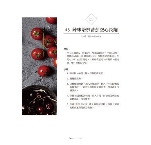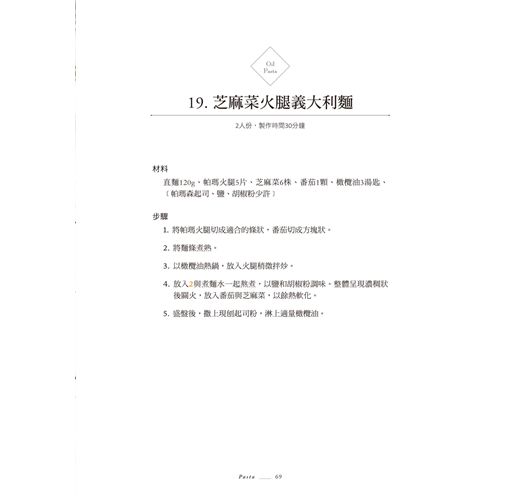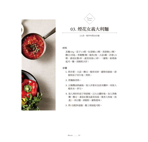 每道食譜均標示出料理所需的分鐘,即使再忙碌的日子,也能挑選出可輕鬆上桌的義大利麵料理。
