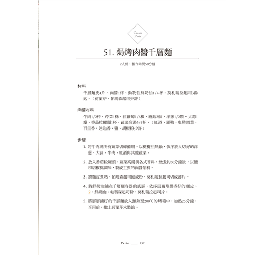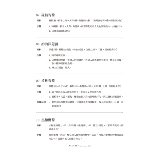 自製番茄紅醬、波隆那肉醬、法式白醬、培根蛋醬、黑橄欖醬、核桃青醬等10種經典醬汁,再延伸出52道義大利麵食譜。