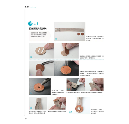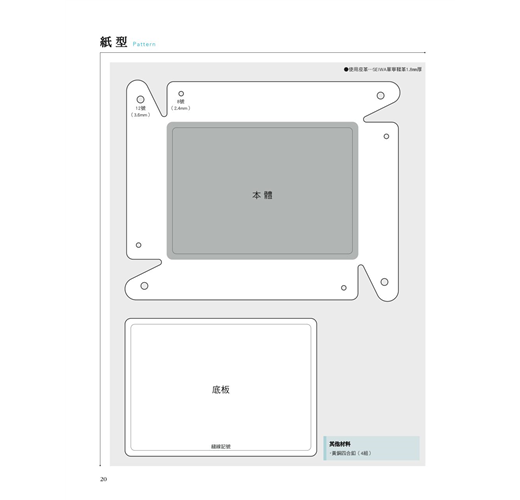 每一款都附上組合示意圖、使用的皮革種類與厚度、皮革以外的材料清單,