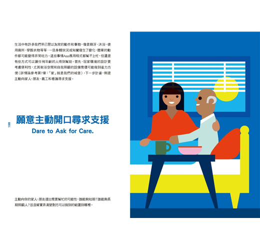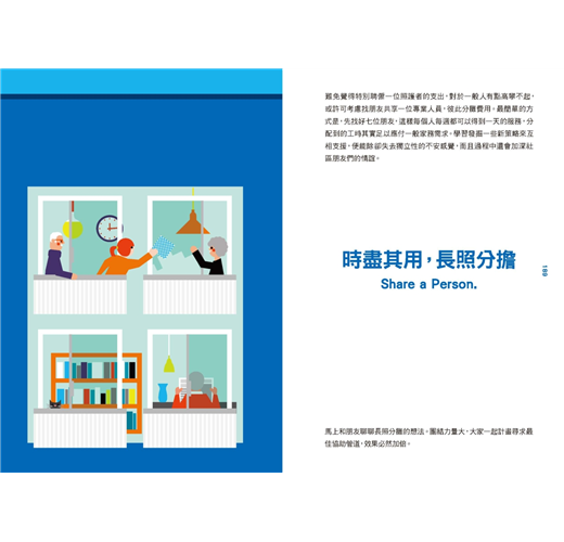 生命中的某些時刻,我們可能過得比較辛苦,需要更多管道獲得協助。最好的協助模式可讓人在過程中減輕負擔,卻又不會直接取代原有的自理能力。比如利用宅配服務把東西通通送到面前,或找尋服務仲介公司、策略結盟單位、經常互助的朋友、嶄新科技等,這些優質服務並非只針對老年人經營。一個成熟體系通常會提供跨城市的服務,積極為各個年齡層服務。
