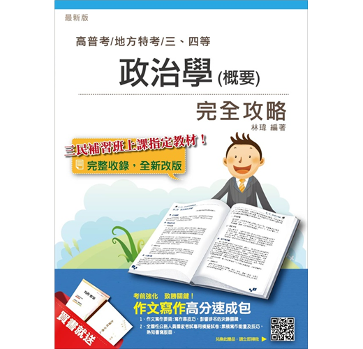 《政治學(概要)完全攻略》由三民權威名師依最新年度命題大綱編寫與歸納,隨考情變化更新修正,關鍵考點清楚明瞭,將繁雜理論及學說以條列方式,深入淺出,陳述清楚,相似名詞文字輔以表格彙整,幫助考生徹底明辨相似名詞概念,研讀不怕抓不到重點!為了強化學習效果,本書各章開頭皆有老師講解該章考試出題重點及重要名詞解釋,考生可依據老師所說的重點來加強研讀,考前衝刺複習!政治學(概要)完全攻略收錄大量試題演練,申論題部分更由名師精撰擬答,讓您面對申論題型,不再苦於無從下筆!掌握重要觀念並熟讀,不論考題怎麼變化都能輕鬆駕馭!