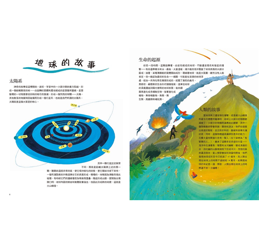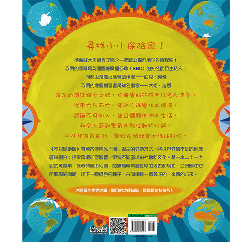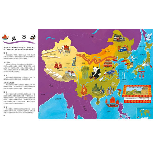 ★非常新穎、翔實的地圖集,一覽地球的海洋和陸地,書中以迷你書式的翻卡、拉頁等方式介紹其人文特色及交通運輸等。迪恩以充滿異國情調及繽紛色彩的畫風,描繪地圖中的人、動物和環境,呈現各區域的特色,如:烏克蘭的哥薩克舞舞者、華麗裝飾的復活節彩蛋,以及出現在馬達加斯加的環尾狐猴。本書強調地球的永續性、互聯性和多樣性,提供孩子在書本中環遊世界,而有更多的發現。隨書附贈世界地圖精美海報。──書商周刊