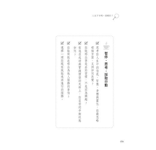 3.書中提供具體的「行動準則」與「暫停.思考.採取行動」,提醒你重新啟動時該抱持的心態,進一步檢視現在的生活,思考更好的做法,並立刻採取行動。