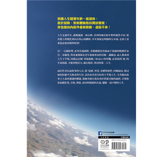「重新啟動」永遠不嫌晚!兩位作者以說故事的方式,從「情感、智慧、身體與靈性」四個面向,探討如何拒絕平凡無奇的生活,活出更充實美好的下半場人生。全書藉由故事主人翁所遭遇的難題、積極突破自我及勇於嘗新冒險的過程,讓你預見下半場人生可能遭遇的心境和考驗,提供各種思考和自我檢視的線索。每篇故事最後提供明確的指引,並給予積極正向的「行動準則」,激勵你過健康、快樂且充滿意義的「第二人生」!