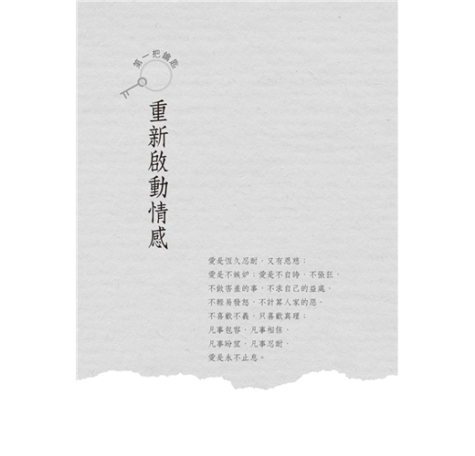 作者以自身經驗告訴你,「情感、智慧、身體與靈性」四把金鑰缺一不可,握有它,可由內而外重新啟動自己,在每件事物上灌注熱情與活力,翻新一成不變的生活,迎向更有價值的下半場人生。