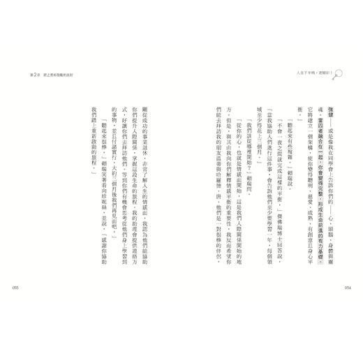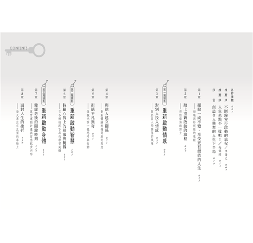 除了重新啟動情感這個第一把鑰匙,人生下半場會過得精彩的人,還要懂得從維持心智上的刺激與挑戰、落實運動計畫、留意飲食內容、找對生命的核心價值,對宇宙萬物抱持敬畏,以及組成成長團隊,大家彼此激勵,享受健康活力的每一天。可以說,書中有許多寶貴而值得學習的行動方案。