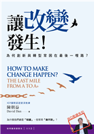 許多企業想改變,也有許多組織主管企圖創新改變,他們知道「離開舒適圈」,才能在當前產業環境快速變化的時代中求存;許多創業或趨勢書籍都探討過「改變觀念」的重要性,而本書作者、華人圈資深教練陳朝益先生,特別由教練模式的角度,詮釋從「觀念到行動」的「改變過程」,為何困難重重又充滿人性考驗?