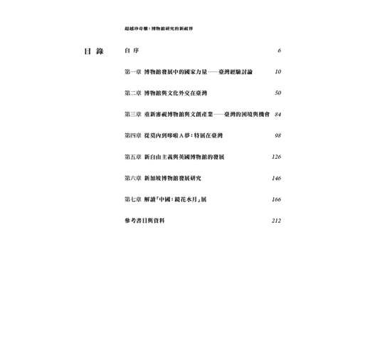 博物館是一個來自西方的建置,以物件的收藏為始。博物館的眾多源起之一,是關於奇珍異寶的蒐集;因此,博物館的原初,常與「珍奇櫃」 (cabinet of curiosities) 一詞相連。此外,隨著時序推演,博物館的研究,在不同的時、地,漸次轉向強調對博物館觀眾的關注。不同於上述傳統,本書討論的是:眾多不同的外在力量,如何影響博物館的發展。這些外在的力量,有些來自文化、政治、社會面的政策,有些來自市場經濟,有些來自全球化潮流(例如文創),有些來自社會的轉變(例如政治、經濟環境)。凡此,均是本書關心與討論的視角。雖然博物館是個文化、教育機構,但是,因為博物館的發展,牽涉的利害關係人多樣且複雜,因此無可避免地會受到不同力量的牽動。然而,正是因為如此,博物館會持續受到不同領域的研究者關注。