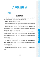 本單元老師以一長篇日文分段解析,每段皆含中文翻譯,還標示了精進閱讀能力不可或缺的材料──重點單字及句型。只要搭配第一單元學習到的文字語彙,以及第二單元學習到的句型文法,再運用本單元老師教導的拆解文章句子的方式,那麼因應N1讀解,可說是輕而易舉。