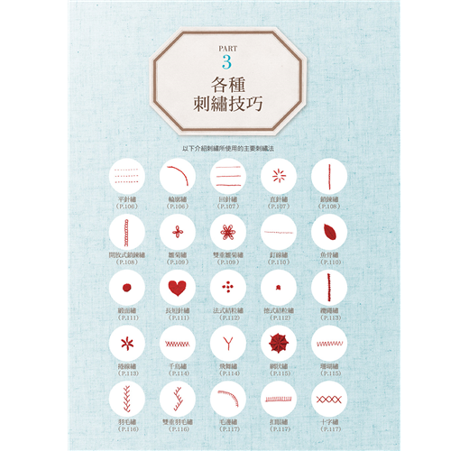 ★玩刺繡必學的25種刺繡針法:以詳解的步驟圖解,簡單明瞭,即使一般的手縫線都能繡出可愛的又活潑的圖案。