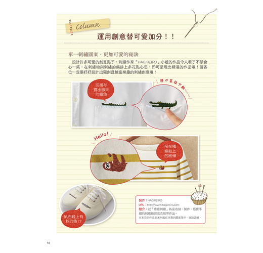 ★刺繡圖案最佳視覺編排祕訣:從衣物的衣領、衣擺、袋口、袖口,以及各種生活中的各類包款、布雜貨,都能找到最佳位置,醒目又俏皮。