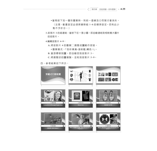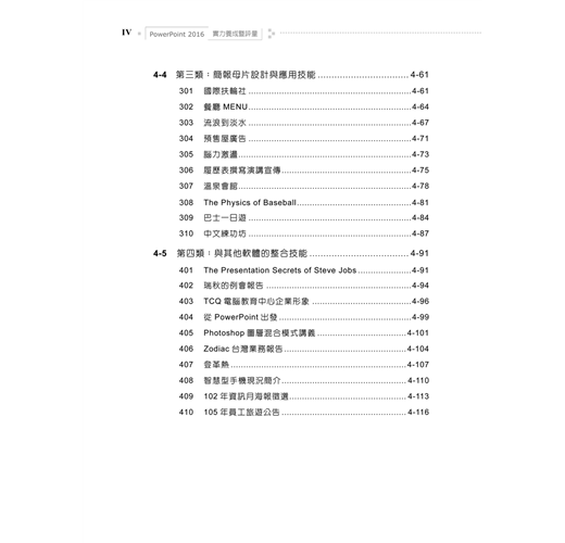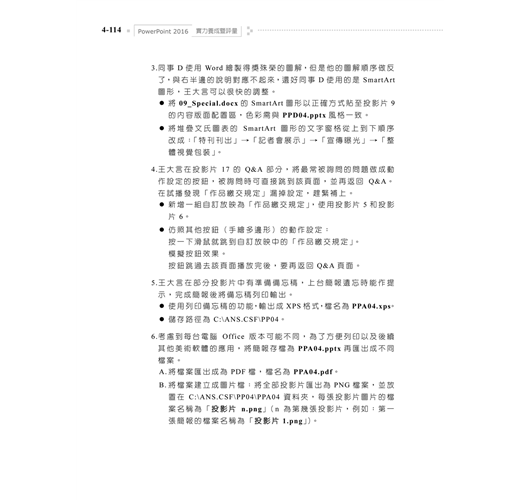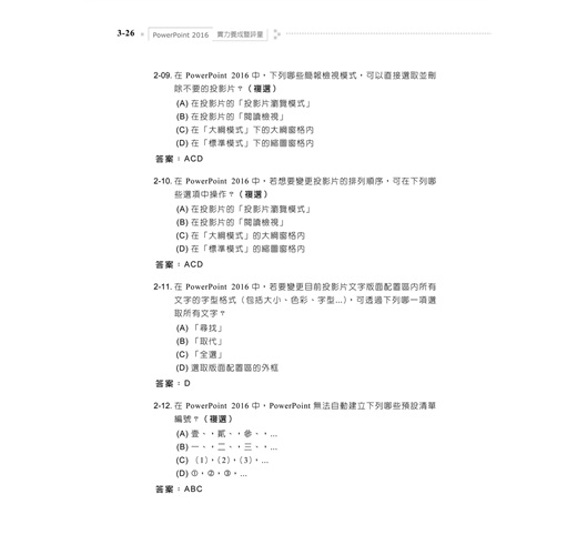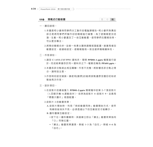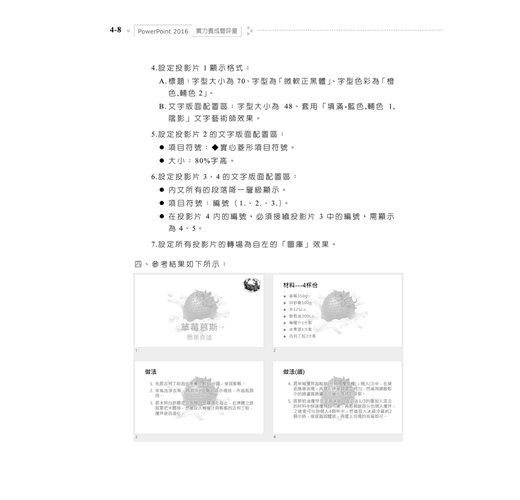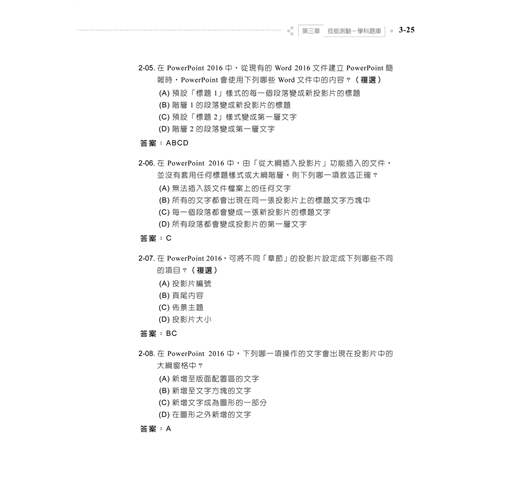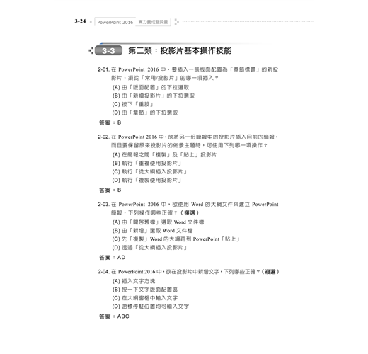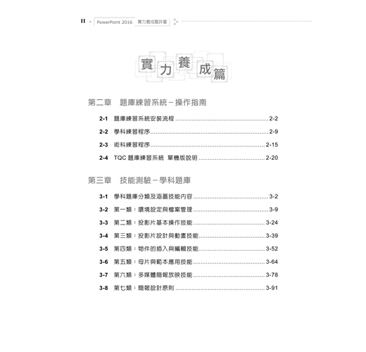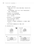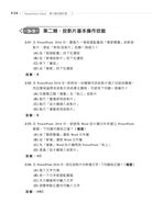 2. 囊括PowerPoint 2016最常用之功能,學、術科題目淺顯易懂,豐富且多樣化,讓讀者能夠循序漸進的學習,熟練PowerPoint軟體的操作。