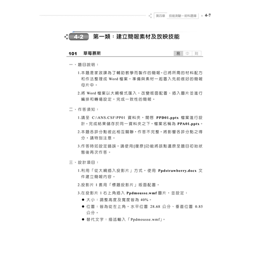 4. 精選術科題庫4大類共40題,包含PowerPoint 2016「建立簡報素材及放映技能」、「編輯與美化簡報及自訂放映技能」、「簡報母片設計與應用技能」及「與其他軟體的整合技能」等類別,使用者可自行指定題目進行練習,透過術科電腦自動評分系統,可立即評核學習成果。