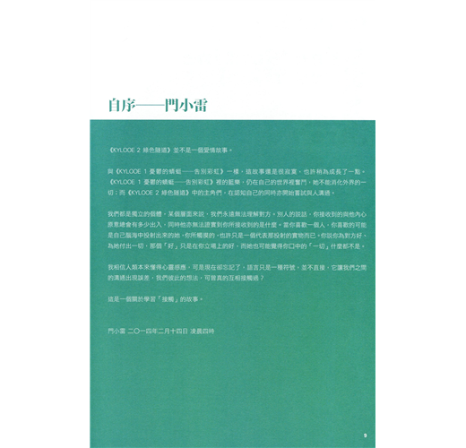 承接《Kylooe1憂鬱的蜻蜓──告別彩虹》,在《Kylooe2──綠色隧道》裡,門小雷繼續以高水準的漫話語言,訴說了另一部青春物語。