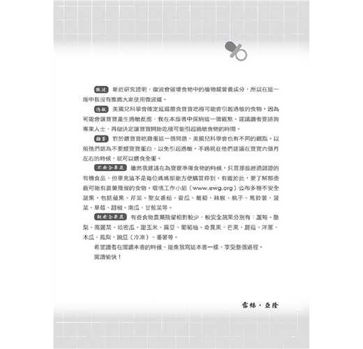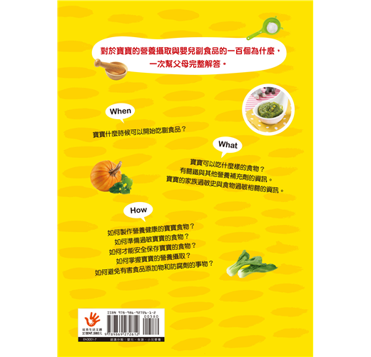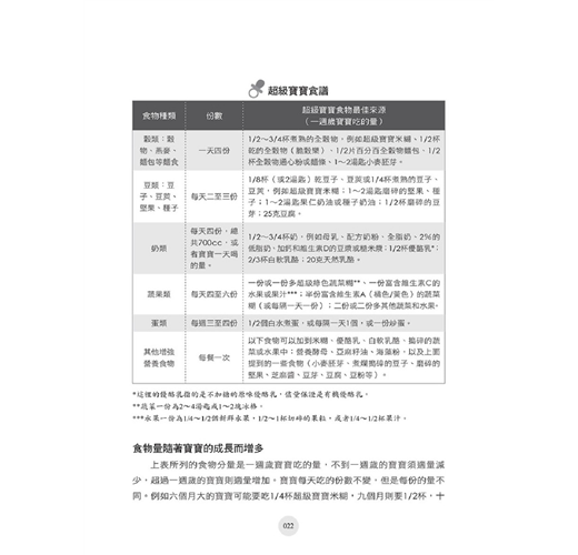 本書告訴您:(1)寶寶可以吃什麼樣的食物。(2)有關鐵和其他營養補充劑的資訊。(3)寶寶的家族過敏史與食物過敏相關的資訊。