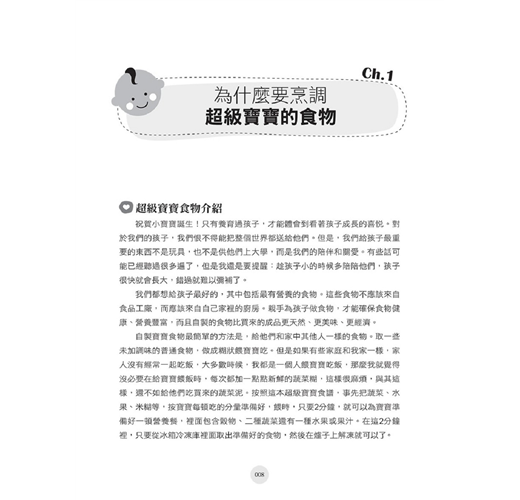 本書內容包含嬰幼兒養育的各種小提示、自製食譜以及相關重要訊息,幫助您解決嬰幼兒養育的各種問題,讓您養育出超級健康寶寶!是新手父母必讀的育兒經典指南。