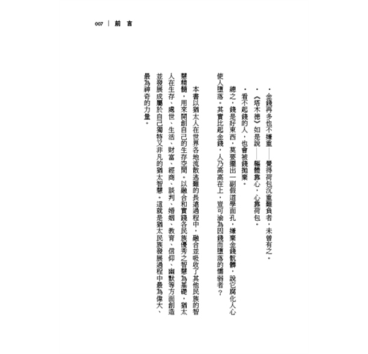 不同的是,猶太人對賺錢始終保持一種「平常心」,也就是始終把賺錢看作是一件極為平常、極為正常的事,既沒有對錢敬之如神,也沒有惡之如鬼,更沒有又想要錢又羞於碰錢,伸手拿錢之際眼睛卻故意飄向別處。