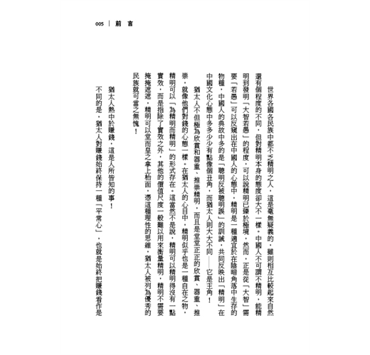 中國人不可謂不精明,能精明到發明「大智若愚」的程度,可以說精明已臻於極境,然而,正是從「大智」需要「若愚」可以反窺出在中國人的心態中,精明是一種適宜於在陰暗角落中生存的物種,中國人的典故中多的是「聰明反被聰明誤」的訓誡,共同反映出「精明」在中國文化心態中多多少少有點像個丑角,而猶太人則大大不同―—它是主角!