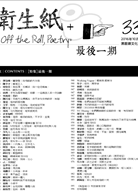 出刊滿八年的《衛生紙+》以第33期告別世界,精銳盡出。唐捐諷刺偽善道德觀的〈孝男為母買麵記〉、陳令洋把語言癌當補品吃的〈我要在上風的地方做一個吸菸的動作〉、宋尚緯演繹海濤法師名言的〈假的〉、鴻鴻針對戴立忍自白事件的回應〈沒有別的愛〉,以及書寫寶可夢現象的質南與冠毛。還有眾多衛生紙詩人如飛鵬子、eL、蔡仁偉、瞇、顆粒、木瑕、小令、阿芒、許赫、張詩勤、謝旭昇等人火力全開的新作,及新馬詩人郭詩玲再接再厲的幽默諷刺。還有香港詩人淮遠寫〈懦夫的百米跑〉、廖偉棠詩贈達賴喇嘛和飲江、日本旅台詩人倉本知明寫〈切切切〉,都是一個時代的記憶。同時刊出紐約前衛詩人傑洛姆・羅登堡的左翼名詩〈致殘酷的大多數〉,更升溫針對這個階級傾軋的世界批判之火。