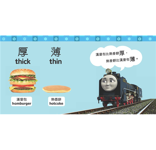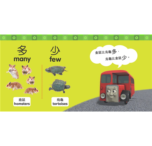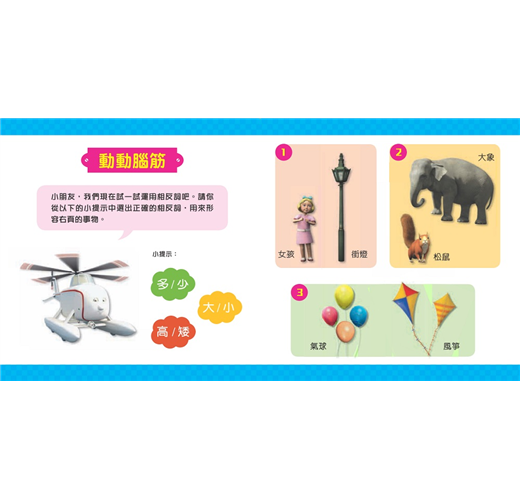 《相反詞》內含5組寶寶經常接觸得到的相反詞,包括:高和矮、大和小、長和短、厚和薄、多和少,並於每個單元內以實物圖具體說明相反詞的意思,加深寶寶對相反詞的認知。