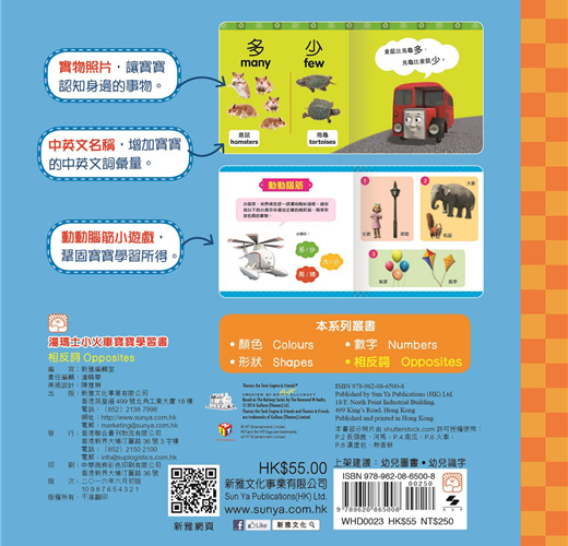 本系列是一套讓寶寶認知不同事物的中英文名稱的學習書,分為四個主題,包括:《顏色》、《數字》、《形狀》以及《相反詞》。圖書採用精美實物照片,方便寶寶與現實物品互相連結,有助認知;另外書後還附有「動動腦筋」小遊戲,鞏固寶寶學習所得和訓練思考力。