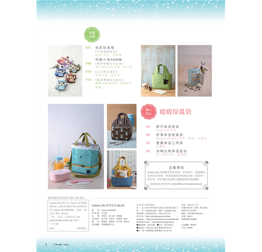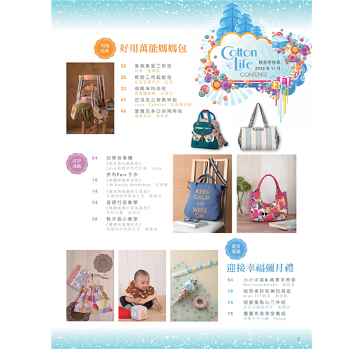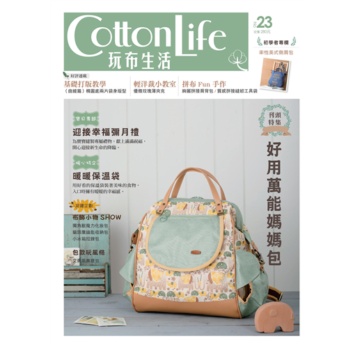 本期Cotton Life推出媽媽包手作主題!邀請擅長車縫與創作的專家,發想出最適合新手媽媽使用的布包款,製作以收納方便與多口袋的作品為主軸,表現媽媽萬能又可靠的形象,送禮自用兩相宜。有創意滿分,讓人眼睛一亮的象親象愛三用包、超好看的素面質感輕甜三用超能包、造型獨特的俏媽咪時尚包、優雅異國風的巴洛克三背媽咪包、大容量的愛寶貝多口袋兩用包,每款都擁有各自的風格與特色。