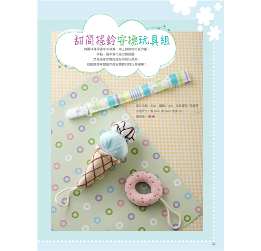 本期專題「迎接幸福彌月禮」,每個人都有機會迎接到寶寶的誕生,手作彌月禮送給親朋好友分享喜悅的氣氛。本期內容有亮麗精緻的小小洋裝&媽寶手冊套、小巧可愛的甜筒搖鈴安撫玩具組、可口甜點造型的甜蜜蜜點心三件組、清爽舒適的圓圓奇異果穿戴組,2-3件為一組的禮物,裝在精美禮物盒中,富含心意又美觀。