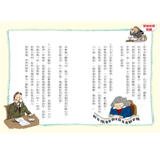這是一本有趣的豐富的智慧寶山!故事後頭,怪咖校長都幫孩子補進各種有趣的小知識,例如貝多芬每天要數六十顆咖啡豆,「最不安全密碼」第一名是123456,愛蓋印章的乾隆皇帝竟有一千八百顆印章……