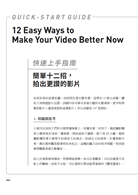 如果你現在就要拍攝,沒時間先看完整本書,這裡有12個小訣竅,讓你立刻增進影片品質。詳細內容可參見各個主題的完整章節。更多特殊主題影片(像是度假和商業影片)的小訣竅從157頁開始。