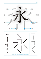 據說全部漢字有十萬之多,多麼龐大的文字系統!就算我們日常使用的三、五千個漢字,比起二十六個英文字母也要複雜得多,但是如果我們換一個思路想一下,眾多的漢字都是具有意義的基本詞素或詞彙,而與字母對應的可能是很少的單位。我們都知道羅馬字的設計基於嚴格的骨骼線圖,中國人也很聰明的找到了對應眾多文字的歸納方法,這就是「永字八法」(圖2-1-1),在一種米字形的母圖中構建複雜與簡潔的漢字筆畫。「永字八法」包括橫、豎、撇、短撇、提、點、捺、鉤八個筆畫的歸納,這種將繁雜歸於簡化快捷的編輯設計對於今天同樣影響巨大。我們知道漢字在最初進入電腦時遇到令人頭痛的問題,漢字那麼複雜,怎麼按照英文的思維方式進行編輯輸入呢?最終,五筆漢字輸入的發明與漢語拼音的對應把這個問題解決了。五筆與「永字八法」有著密切的聯繫,五筆更加高度的歸納了漢字筆畫的基礎單位,捺、點與鉤合為一筆,折歸入豎與橫,最終歸納為「橫、豎、撇、折、點」。五筆發明以後,漢字的輸入速度就一點不遜色於英文了。