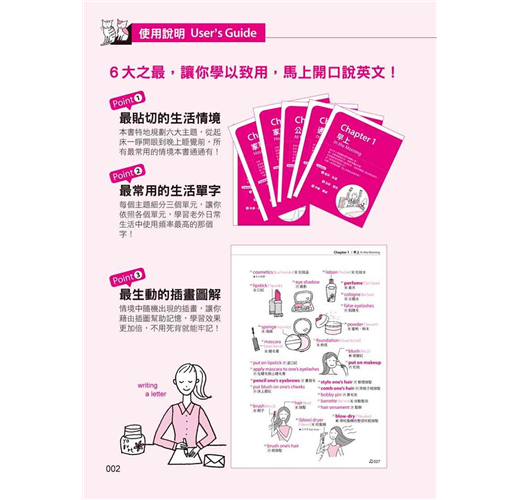本書以圖像結合單字,利用視覺聯想,幫助讀者加強記憶。讀者更可利用隨書附贈的「神奇遮色片」,不僅可以進行自我測驗,提升學習成效,也可以反覆練習讓英文自然侵入你的大腦!