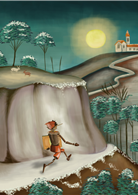 因為肚子越叫越大聲,皮諾丘也不知道要怎麼讓肚子安靜下來,決定到鄰近的村落去看看,希望能找到好心人分他一點麵包吃。