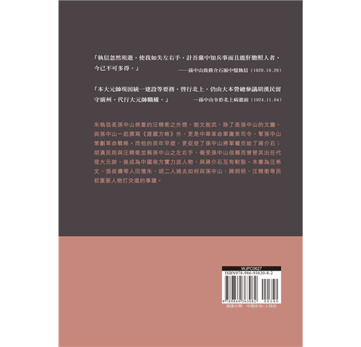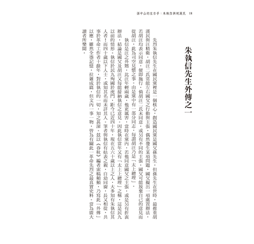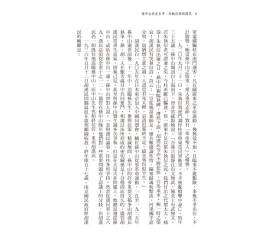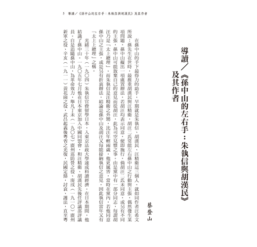 朱執信是孫中山倚重的汪精衛之外甥,能文能武,除了是孫中山的文膽、與孫中山一起撰寫《建國方略》外,更是中華革命軍廣東司令,幫孫中山策劃革命戰略。而他的英年早逝,更促使了孫中山將軍權交給了蔣介石;胡漢民則與汪精衛並稱孫中山之左右手,備受孫中山信賴而曾替其出任代理大元帥,後成為中國南方實力派人物,與蔣介石互有較勁。本書為汪希文、張叔儔等人回憶朱、胡二人過去如何與孫中山、陳炯明、汪精衛等民初重要人物打交道的事蹟。
