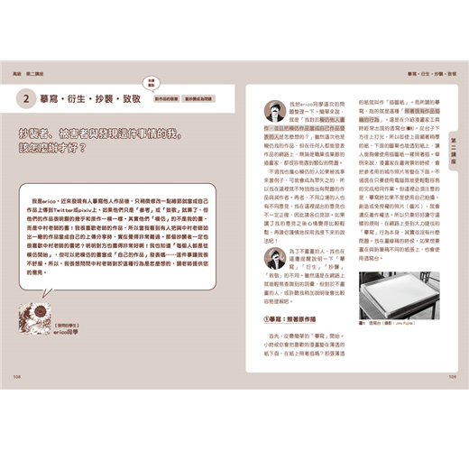 尤其在高階與輔導室裡,有許多我常常在臉書收到關於插畫疑問的解答。其中,我覺得最受用的是所謂「摹寫、抄襲、衍生、致敬」這個篇章,把我心中長久說不太明白的疑惑都好好講清楚了。