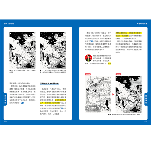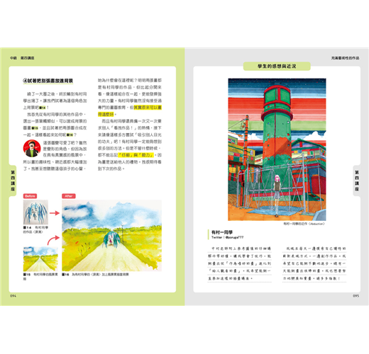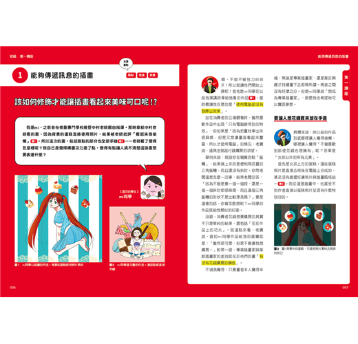 中村老師在這本書裡面有初、中、高階與輔導室四個大章節。每一個階段都仔細地診斷每位學員畫作的問題,但都不是針對技法(畢竟那要靠自己努力啊!),而是提供非常明確的表現方向與詳盡畫面配置與建議,並且使用許多知名插畫家作品當作解說範例,連我這個插畫執業者,都能在每個篇章裡有所收穫。而這些提出問題的學生都一一留下社群網站帳號,可以去看看他們現在的確實表現。不知怎的,讓我感受到中村先生的溫暖!(那是非常幸福的感覺啊!)