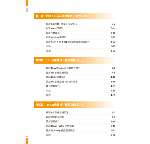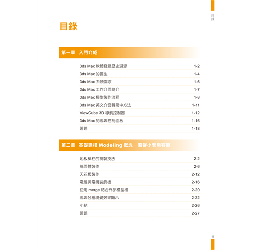 ‧ 每章皆附習題,讓讀者從「選擇題」、「問答題」、「實作題」中快速複習章節要點,建立正確的3ds Max操作觀念。