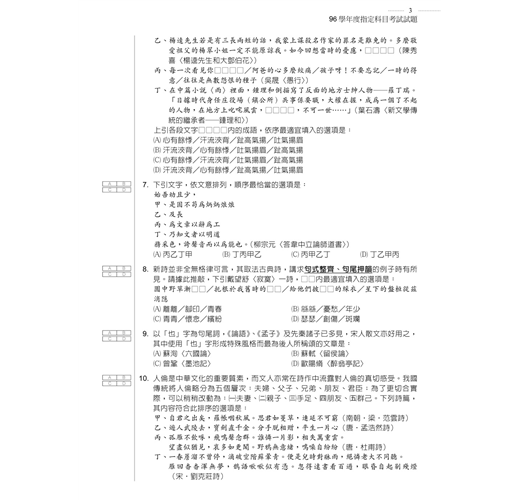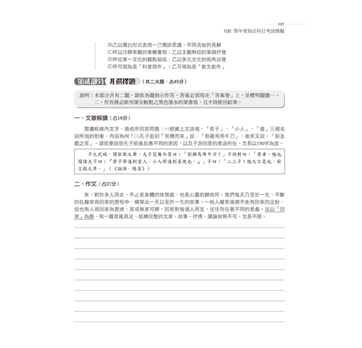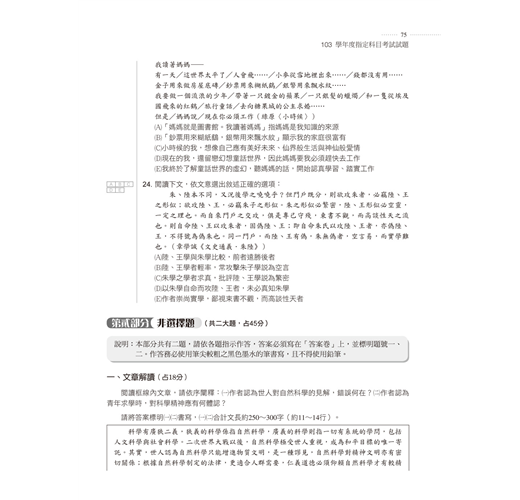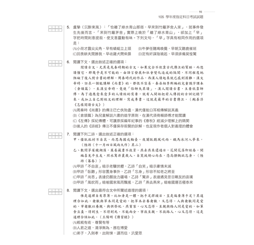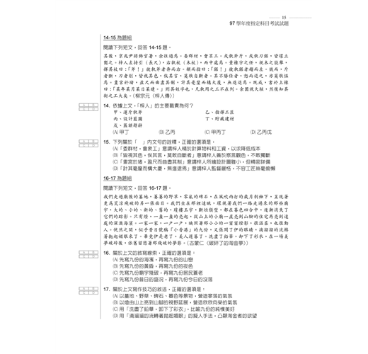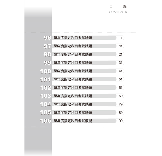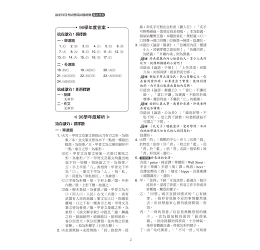 本書內容編排方式依照大學入學考試中心所公布的題本,答案欄的設計也是採用大考中心的填答畫記方式,讓同學們立即進入仿真情境。最棒的是還有可抽出對照「試題」與「答案解析」的「獨立解答本」,自我測驗後,找答案、看解析超方便!對於即將上考場的同學們而言,「知己知彼,才能百戰百勝」,熟練歷屆試題,真實模擬演練,絕對有加分的效果!