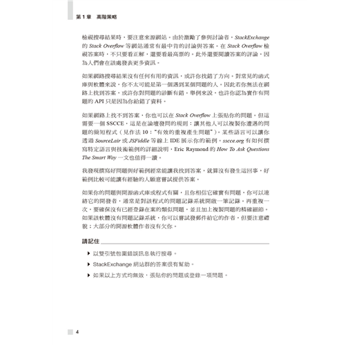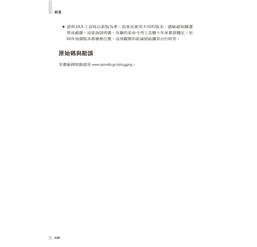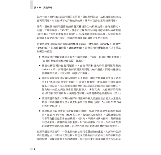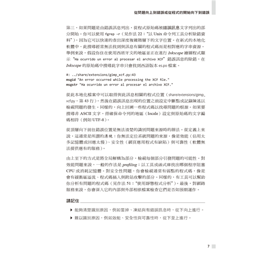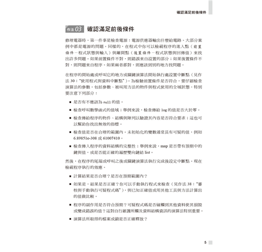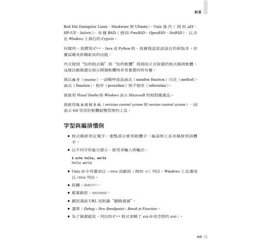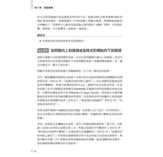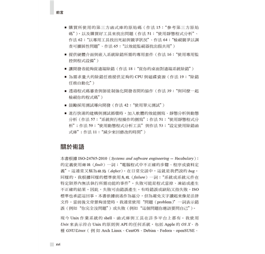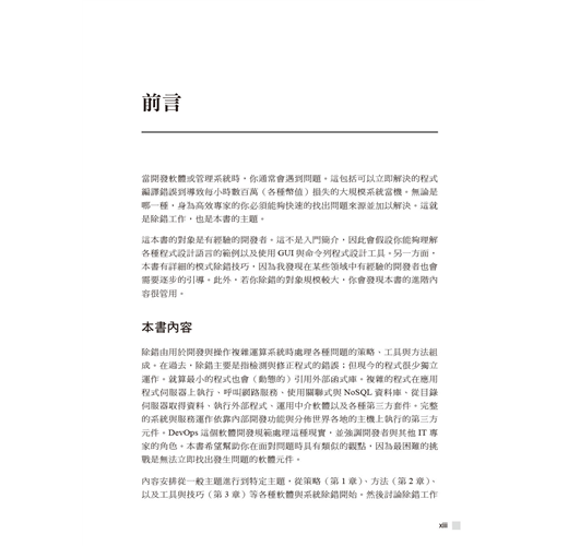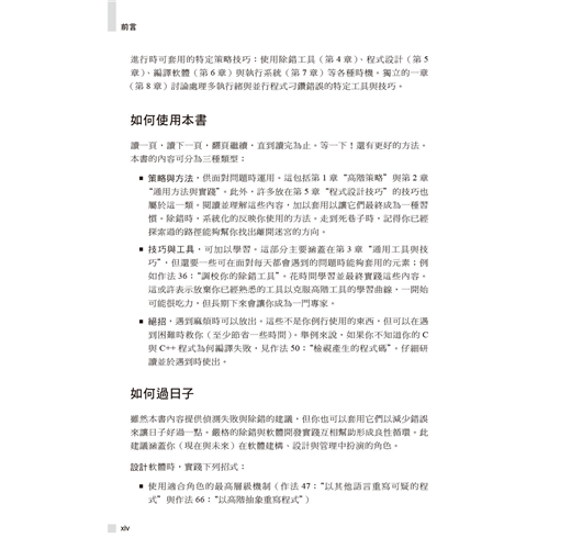 作者以超過三十五年以上的經驗幫助讀者擴展除錯技術,於各種情境選擇最佳方式。書中展示了大量通用原則、高階策略、扎實技巧、高效工具、創意絕招與行為軌跡的高效除錯範例。