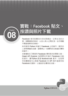 Facebook是目前最流行的社群網站,日常生活的分享、相關資訊的吸收,以及人與人之間交流,似乎都離不開這個無形的領域。如何使用Python來進行Facebook上的操作,是許多人很有興趣的主題,這裡將以一些實用的功能進行實例的操作。