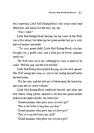 「是您的孫女,小紅帽呀!」野狼模仿小女孩的聲音,「我從媽媽那兒帶了些煎餅、還有一小罐奶油來給您。」