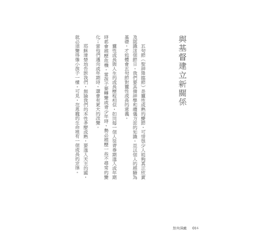 本書結合聖經默觀與靈修學,精采生動地詮釋福音故事,探究福音人物在信德與愛德上增長的榜樣,精闢分析靈性成長的歷程。巧妙運用發展心理學的觀點,並列舉生活實例,講解默觀祈禱帶來的豐富寶藏,逐步帶領讀者加深與耶穌的關係,為信仰注入勇氣與活力。
