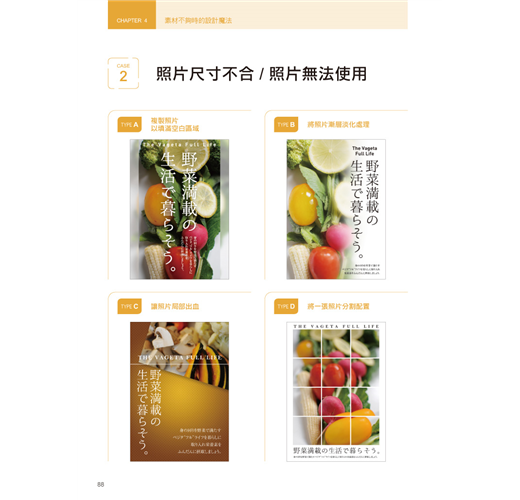 ★ 本書的特色就是會模擬各種限制條件,例如:只能單色印刷、只能印成黑白、圖片尺寸不對、照片品質太差…,讓你了解在高壓的設計環境中,如何快速解決你面對的問題。