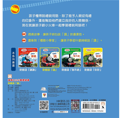 孩子懂得說禮貌用語,除了能予人親切有禮的印象外,還能幫助他們建立良好的人際關係。 《湯瑪士小火車禮貌書》系列一套四冊,分別教導孩子說四句禮貌用語,包括「謝謝」、「請」、「對不起」,以及「你好」。